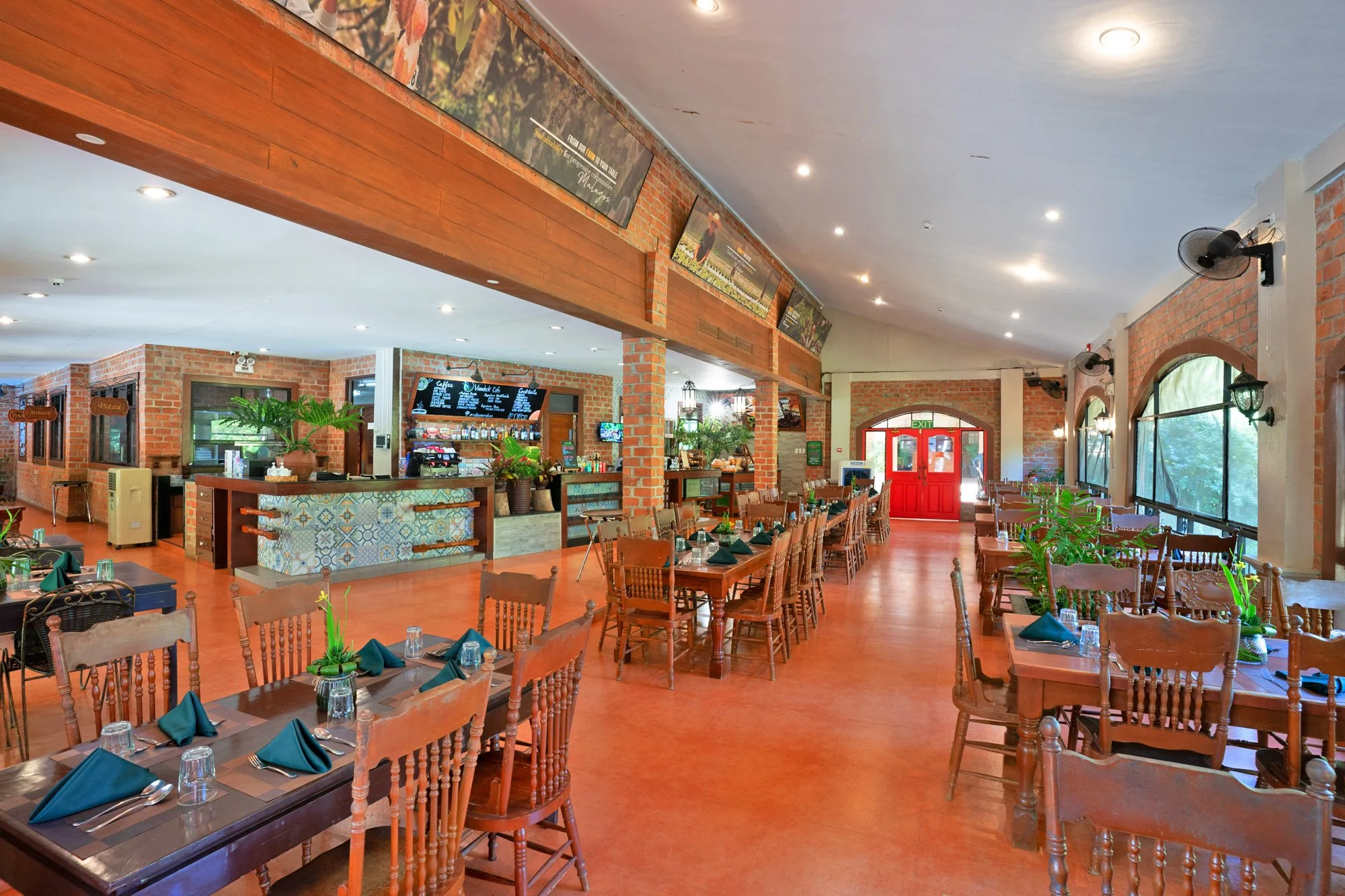 Warm hardwood finishes, Mediterranean tiles, and brick interiors beautifully complement the lush, rustic surroundings of Malagos, creating a cozy setting perfect for intimate gatherings and joyful family meals.